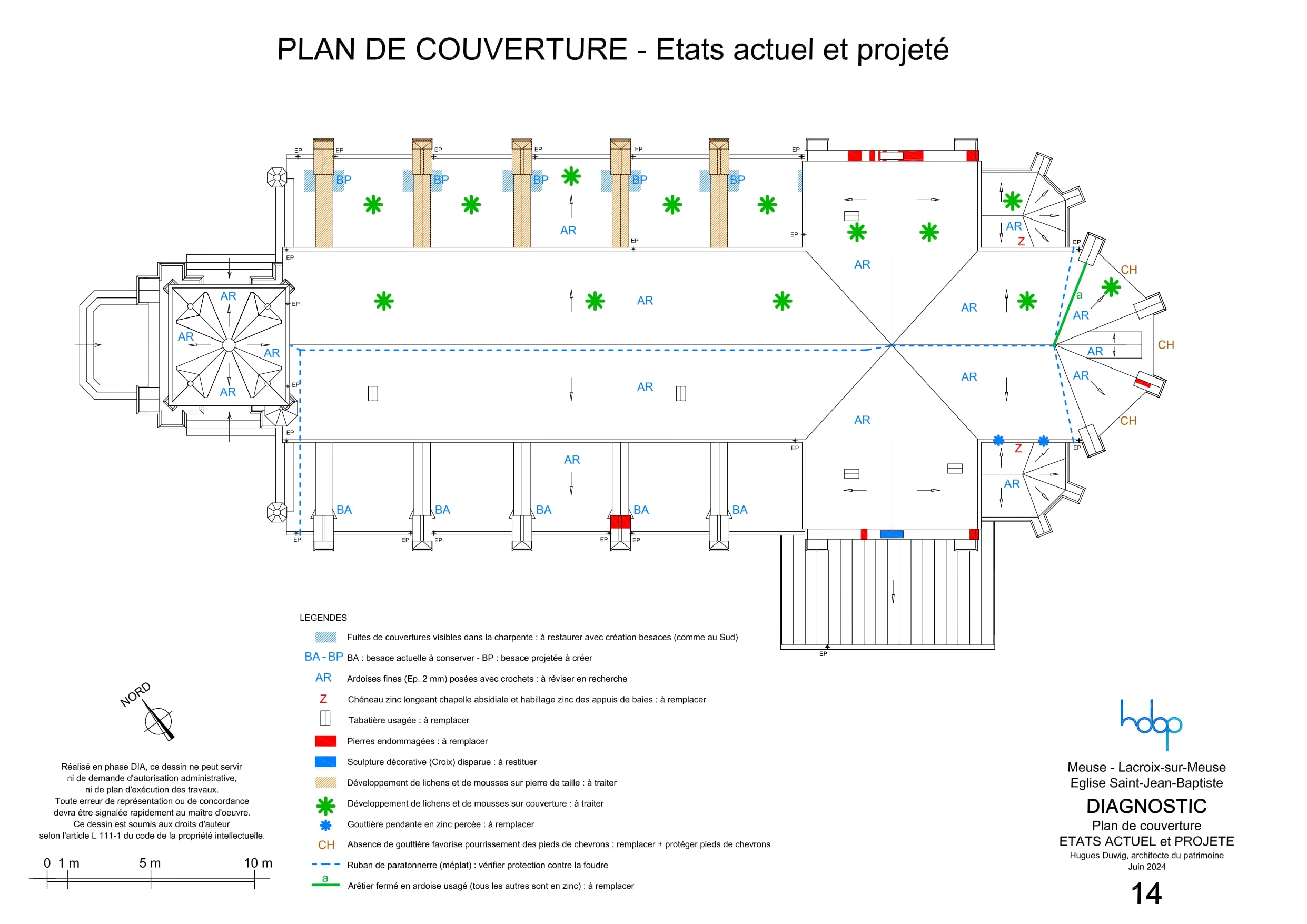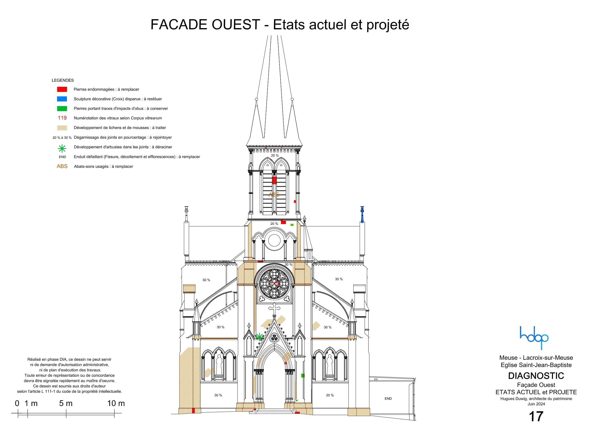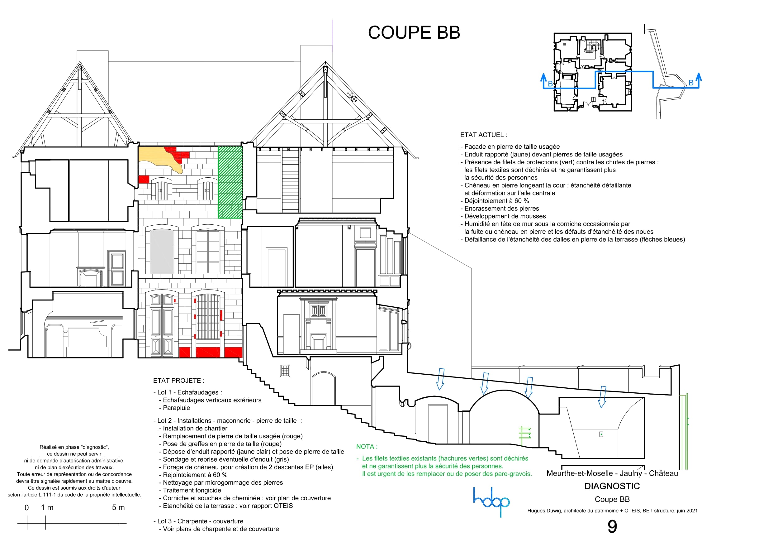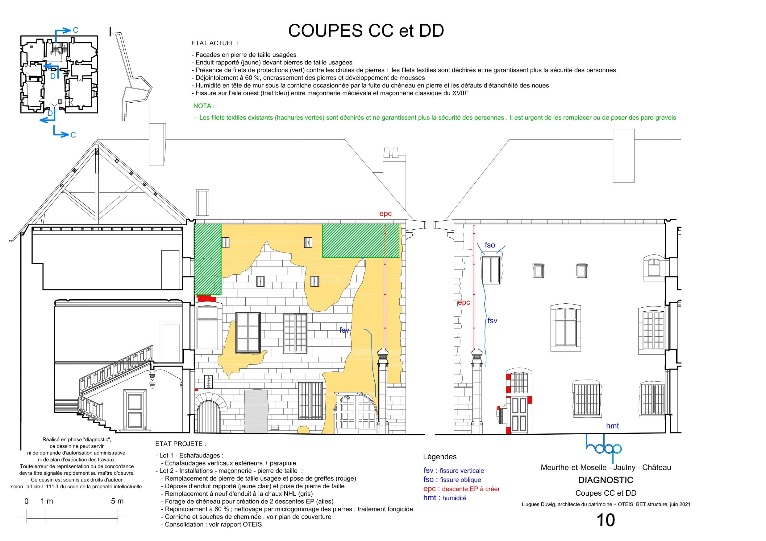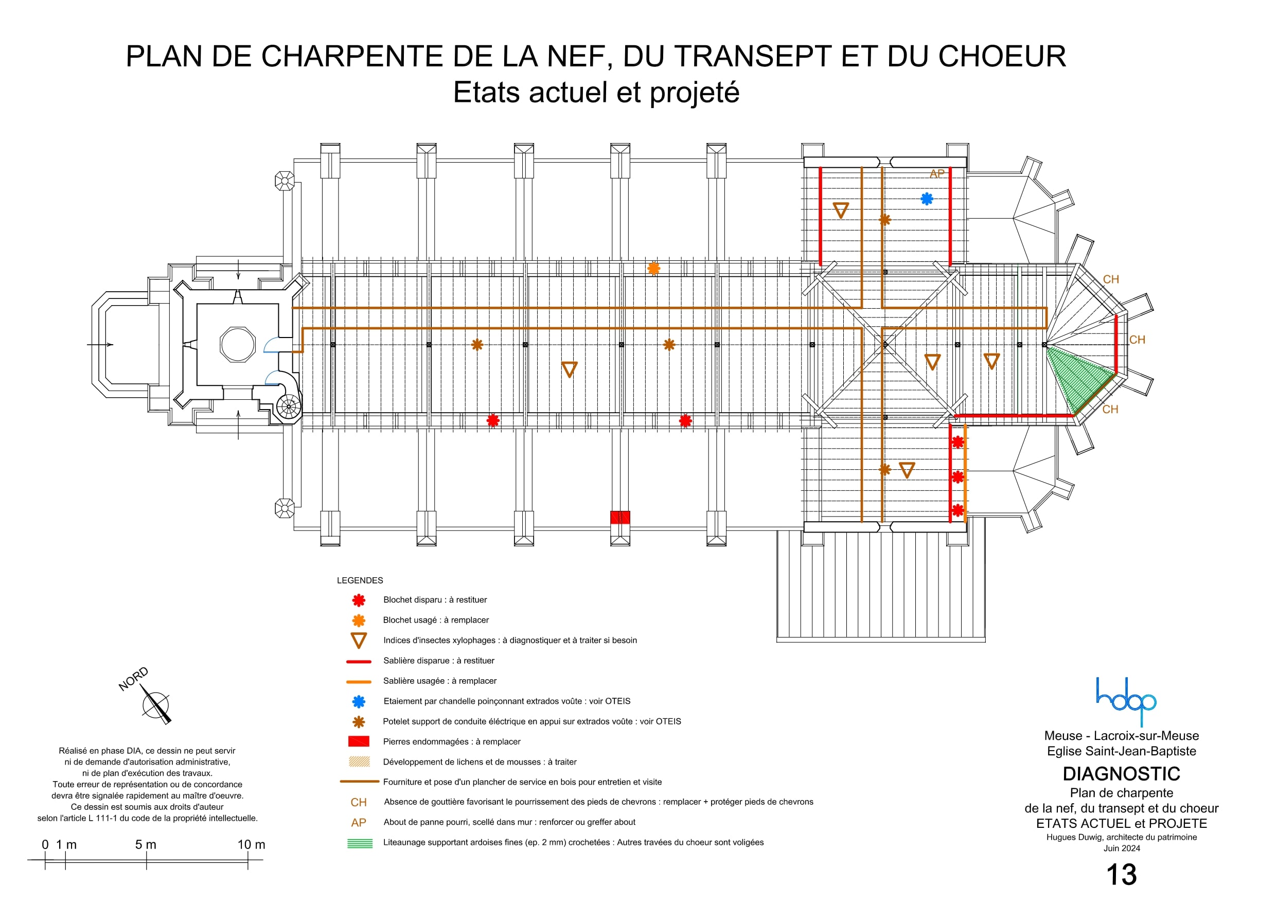 Le diagnostic a pour objet de dresser un bilan de santé du monument. Il comprend les relevés, les études historiques, l’état sanitaire et les premières propositions de travaux. Des tranches de travaux sont proposées en fonction des urgences.